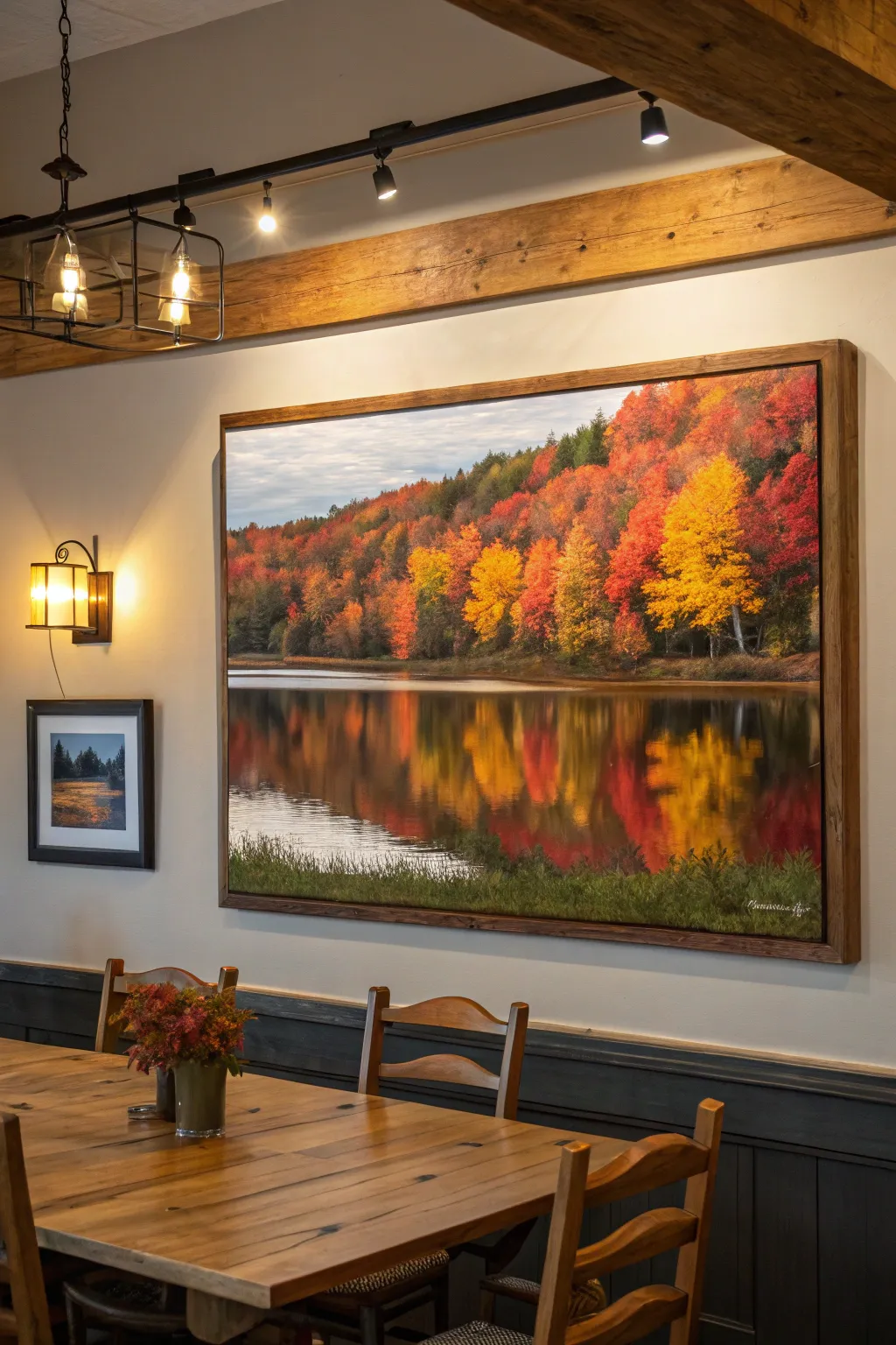 Capture the serenity of a lake mirroring autumnal hues for a soothing effect. This painting is a favored choice for dining spaces, delivering a serene vista that enhances mealtime experiences.