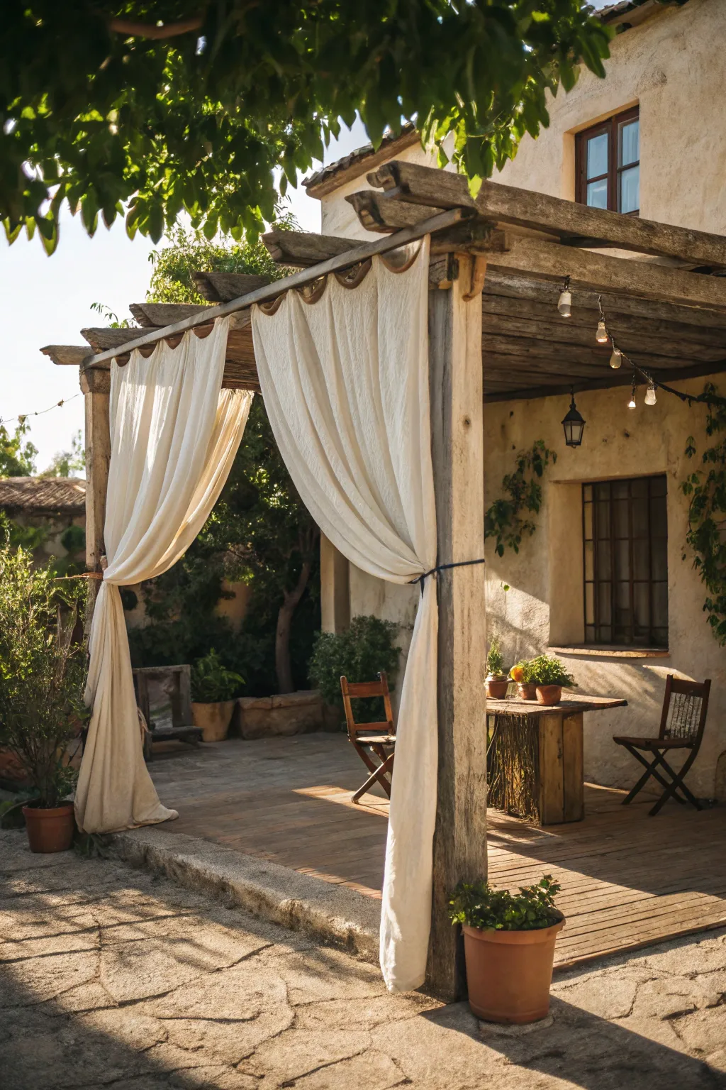 Drape material over a wooden framework for a DIY awning that’s both countryside and personal. I reveled in selecting vibrant, countryside patterns for my expanse.