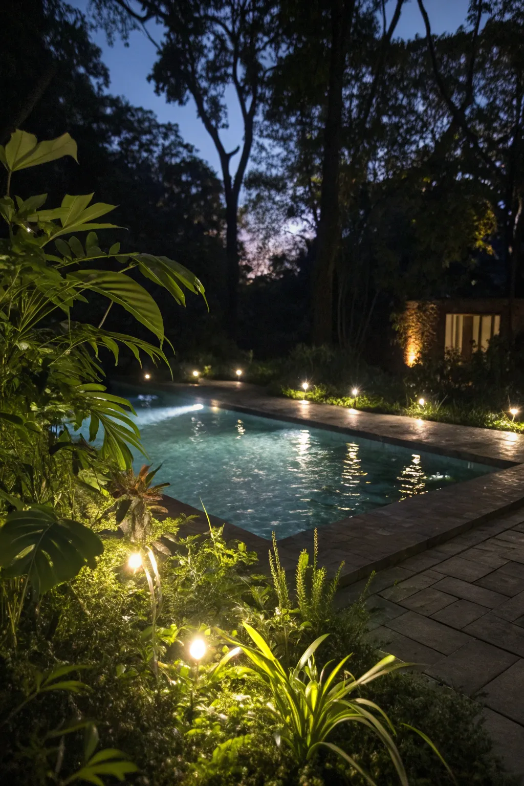 - Subtle Stone Path Lights: Highlight your stone-accented pool area with discreet lighting, establishing a captivating nocturnal setting.