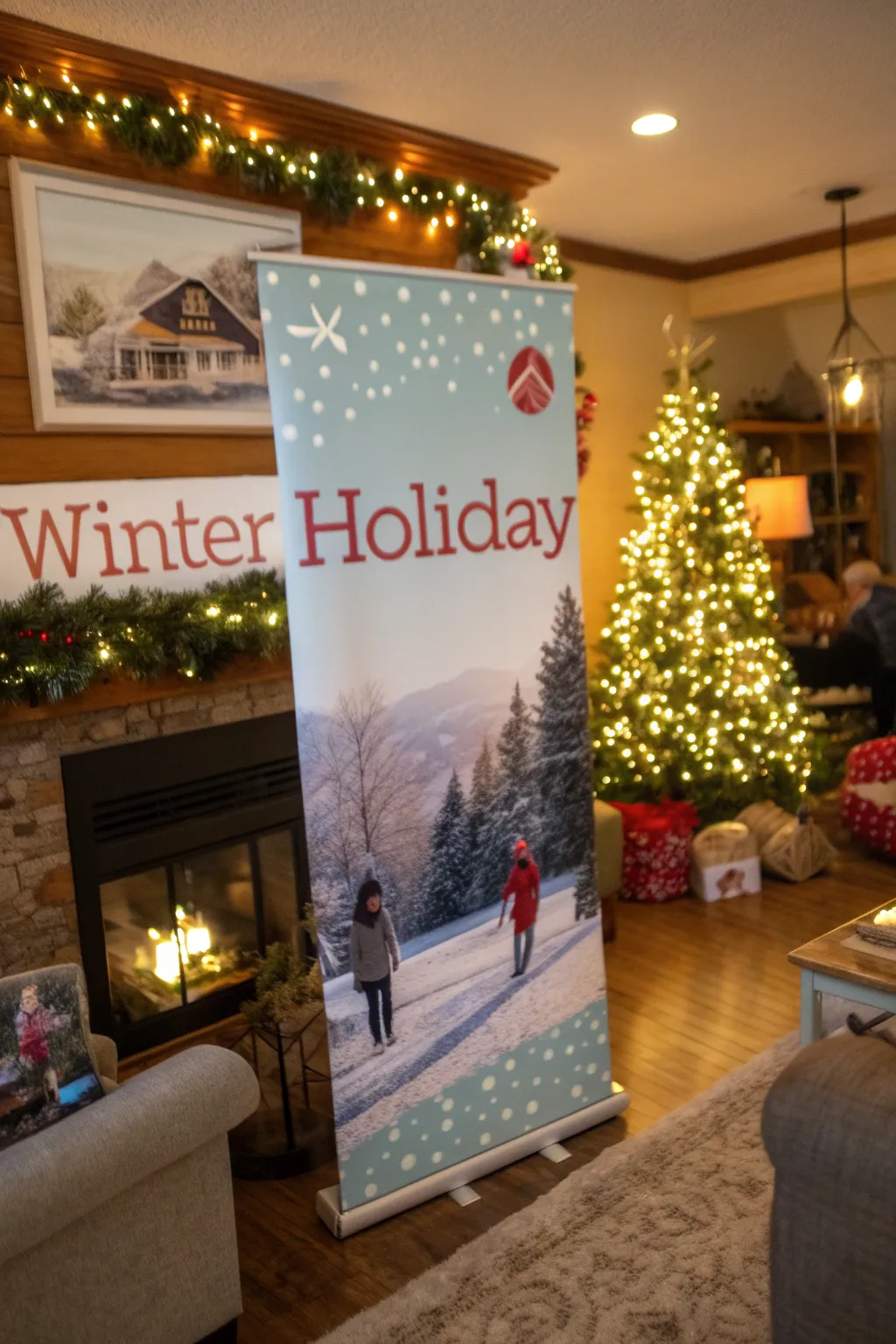 Enter the festive spirit with a celebratory banner that complements your seasonal decor. My favorite is a snowy winter theme that brings comforting cheer.