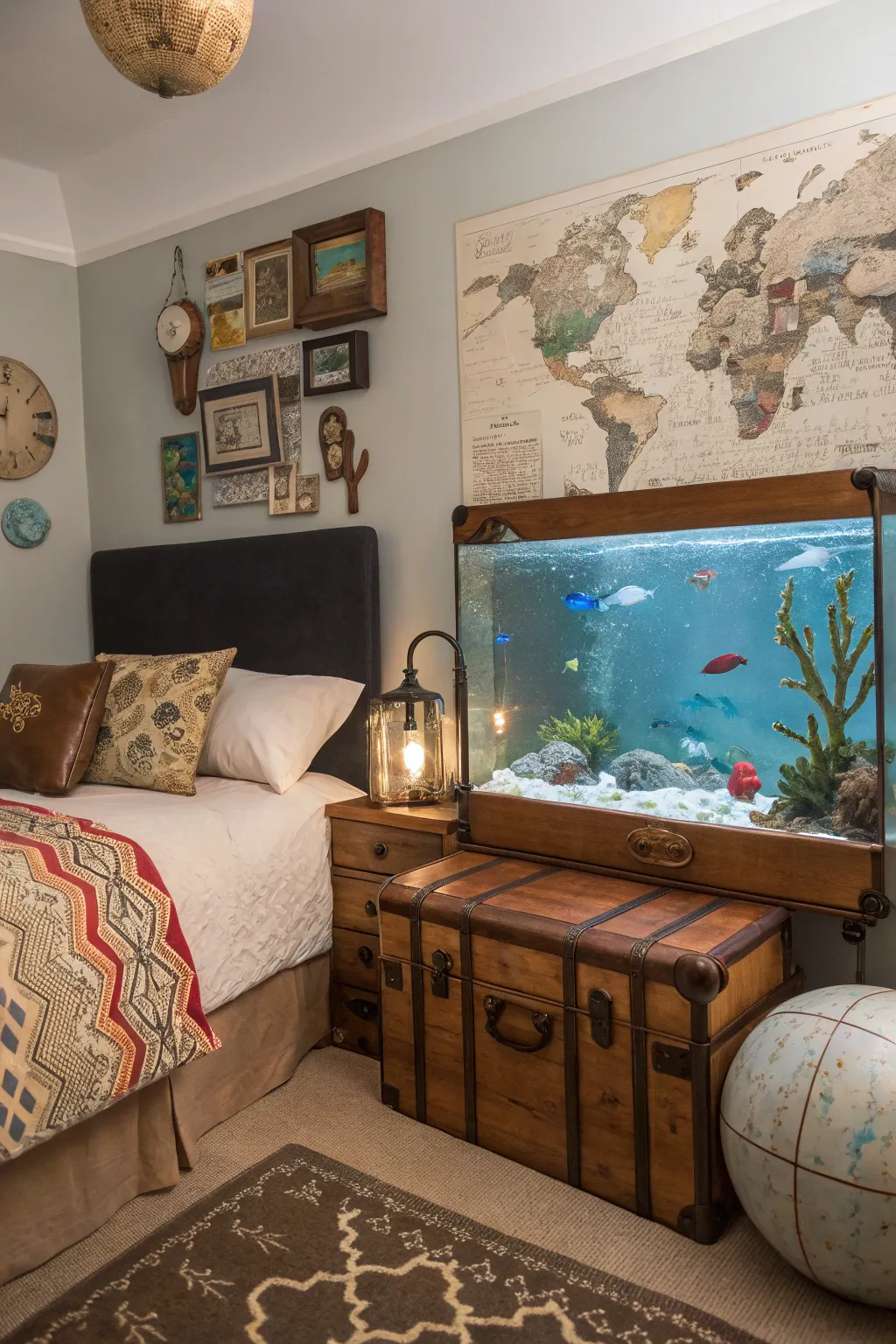 • Retro-Styled Case: Incorporate a retro-styled case for supplementary storage and bona fide travel-inspired ornamentation within your sleeping quarters.