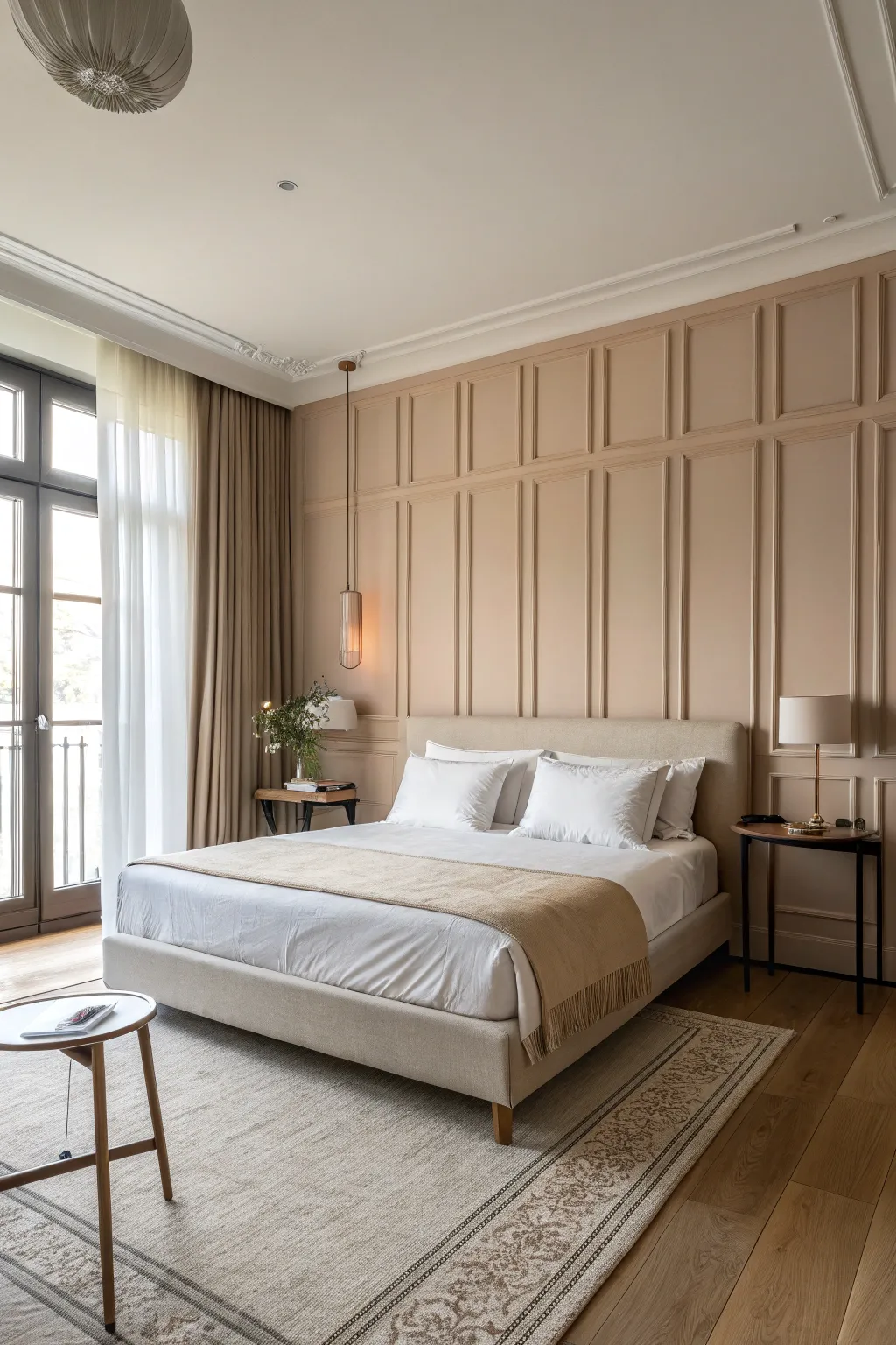 Combine art and paneling through integrating wall murals. This bold choice turns your bedroom wall into an engaging focal point.