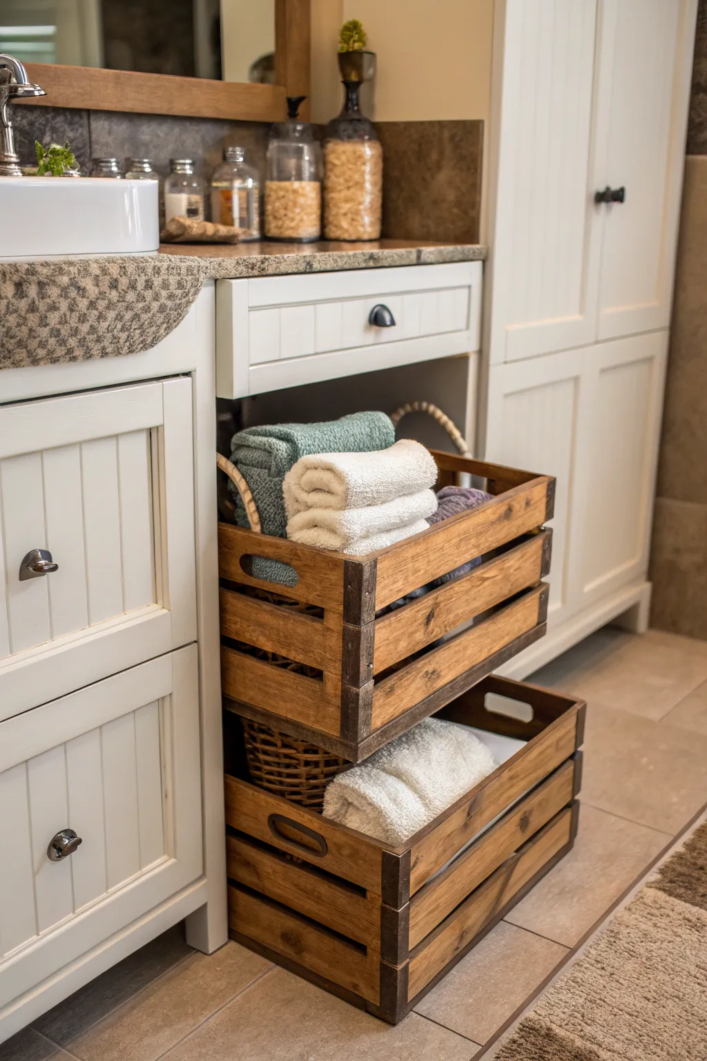 - Aged Wood Crates: Arrange your goods in a trendy manner with rustic wood crates, adding a nostalgic feel to your bathroom decor.