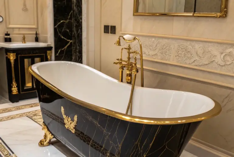 There is an undeniable allure to a bathroom adorned in black and gold. The striking contrast and rich hues come together to fashion a space that is both welcoming and elegant. Mosaic Embellishments in Ebony and Gold Mosaic embellishments in ebony and gold introduce elegance and texture. Employ mosaic embellishments in ebony and gold to forge elaborate designs that heighten visual intrigue and sophistication on your restroom floors or walls. Products that could assist: Sheets…