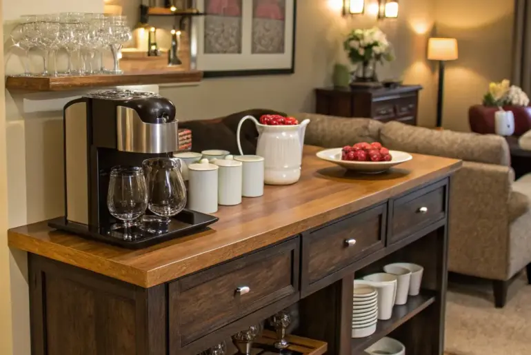 Designing a space that caters to both coffee and wine enthusiasts can truly elevate your home into a personal sanctuary. Let’s delve into some distinctive concepts that seamlessly merge these two passions within your living space. Concealed Organizing Alternatives Concealed organizing keeps your bar neat. Contemplate concealed organizing alternatives for a tidy appearance. These are suitable for stowing away infrequently used items. Useful items to consider: Under-Cabinet Glass Storage: Optimize area and keep glasses organized…