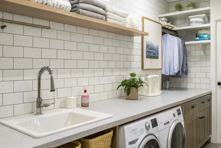 While a laundry room is mainly utilitarian, a thoughtfully designed backsplash has the power to transform it into a stylish and welcoming area. Let’s explore some innovative concepts to elevate your laundry space. Exposed Shelving Exposed shelving unifies practicality with decorative flair. Merge practicality with aesthetics by adding exposed shelving above your sink. This strategic approach, which I’ve utilized, keeps necessities accessible while spotlighting fashionable pieces. Products that could assist: Elegant Floating Wall Boards: Enhance…
