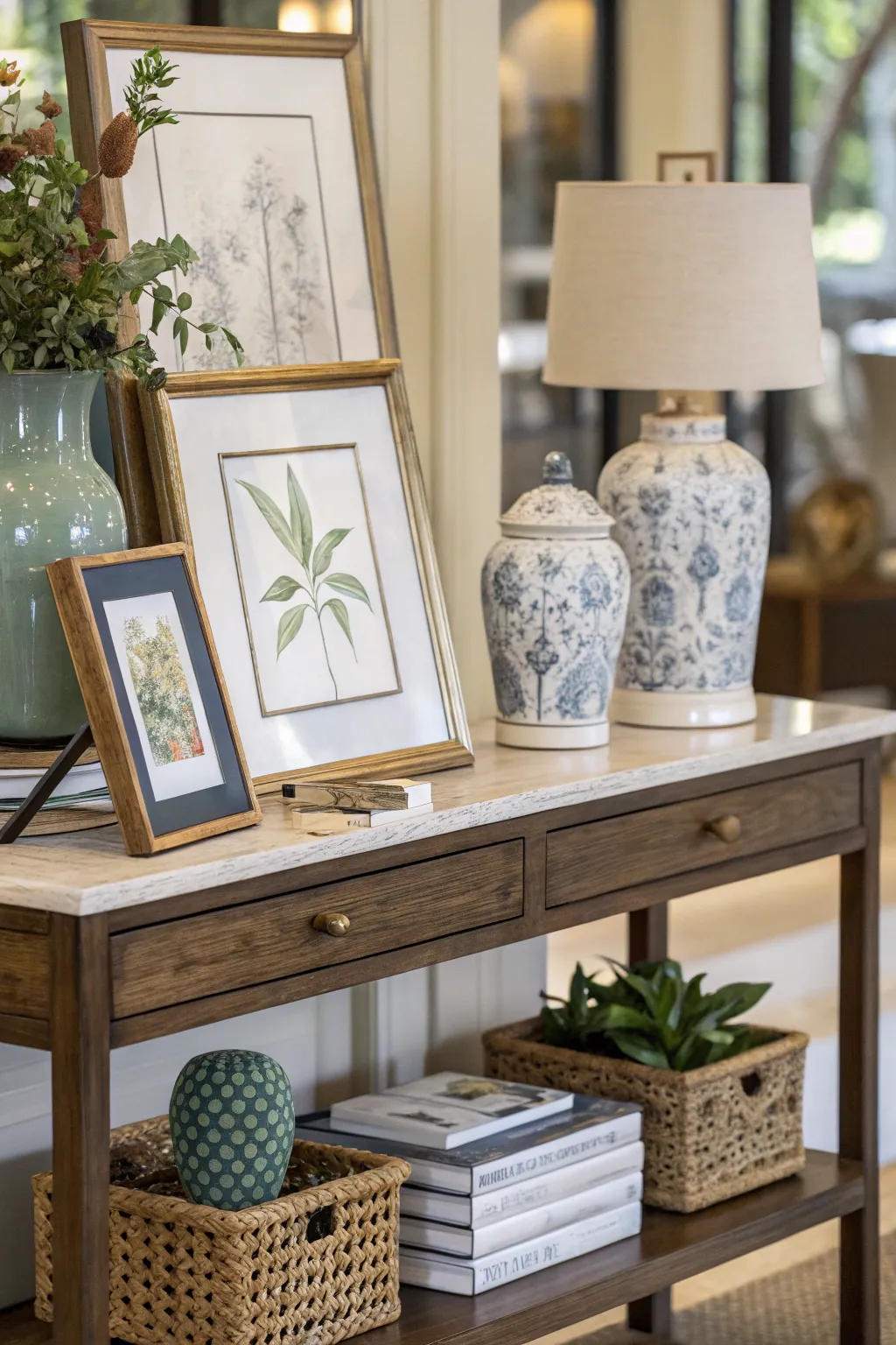 Showcase artwork above or resting on the console table to impart character. I enjoy intermixing frames to forge a relaxed yet thoughtfully arranged gallery atmosphere.