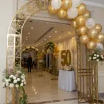 Fashion a balloon arch using hues of rose, gold, and ivory to greet attendees with a hint of merriment. I’m always amazed at how these arches can instantly revolutionize any area, transforming it into a festive haven!