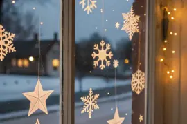 Embrace the celebratory spirit through adorning your windows using joyful accents like twinkling lights and festive wreaths. Each year, I enjoy affixing paper snowflakes to my windows.