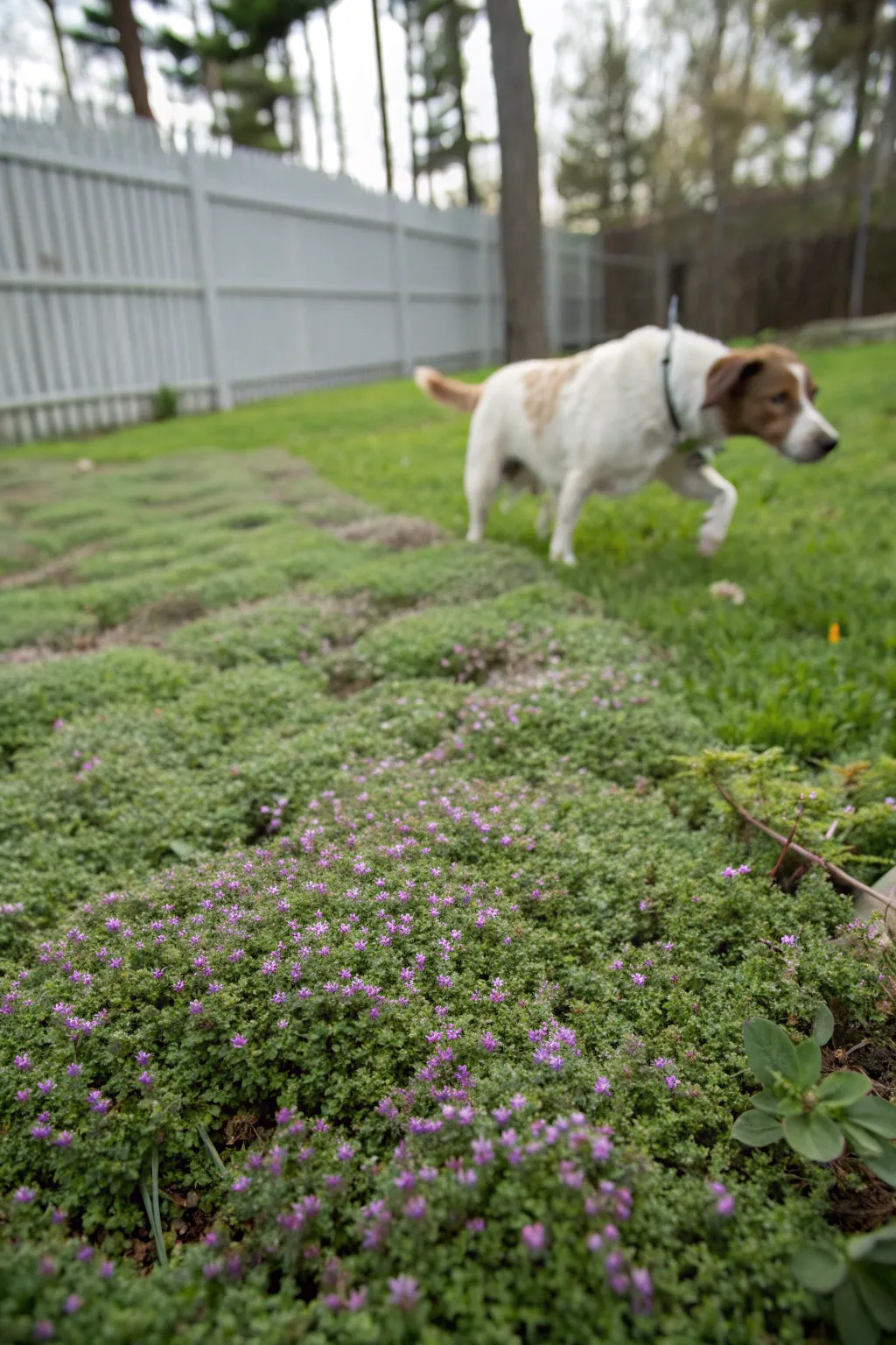 Opt for inherent ground coverings like creeping thyme that can withstand dog traffic. In my yard, these ground coverings are a beautiful and hardy alternative to grass.