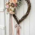 A heart-shaped blossom display, lavishly adorned with silken blooms and delicate ribbons, can easily become the focal point of your Valentine’s Day door. I’m particularly drawn to using a blend of crimson and rosy shades to perfectly embody the spirit of the holiday.