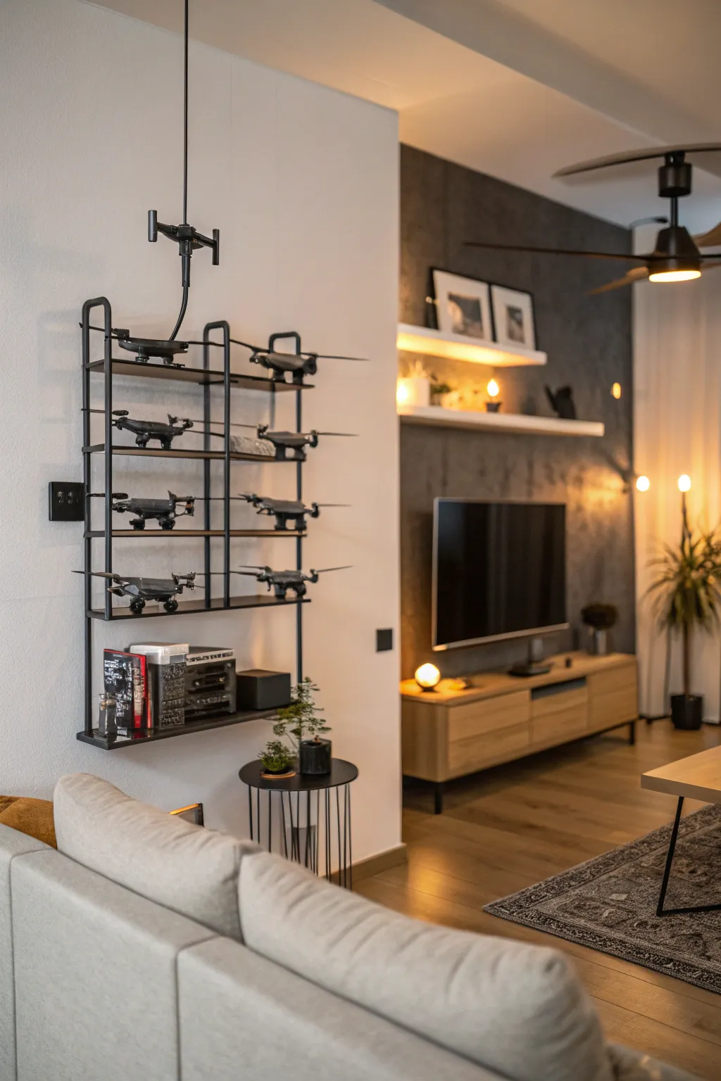 For an unexpected approach, attempt affixing overhead hooks to suspend your drones. This presents a flawless solution for confined areas and contributes an unforeseen element to your décor. Merely guarantee they are firmly attached to accommodate the weight securely.