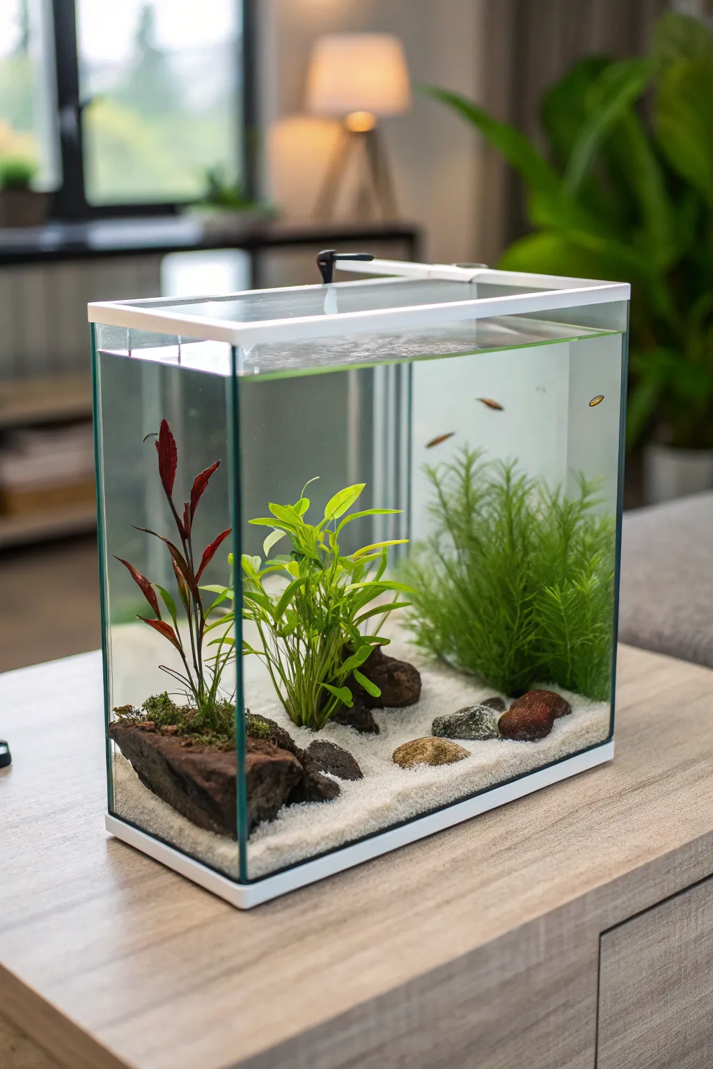 Establish a tranquil escape via a zen-inspired aquarium, finished with miniature sculptures and soothing decor. This arrangement consistently evokes a serene garden to me, ideally suited for de-stressing at day’s end.