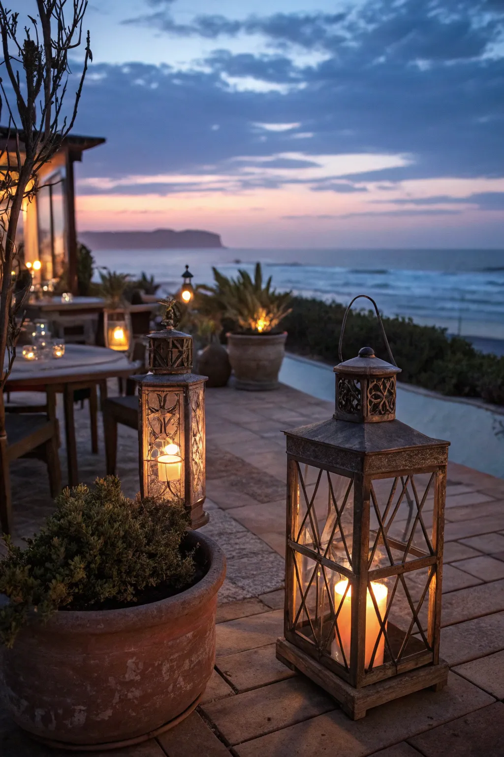 Earthy metal lanterns forge a cozy radiance for outdoor spaces.