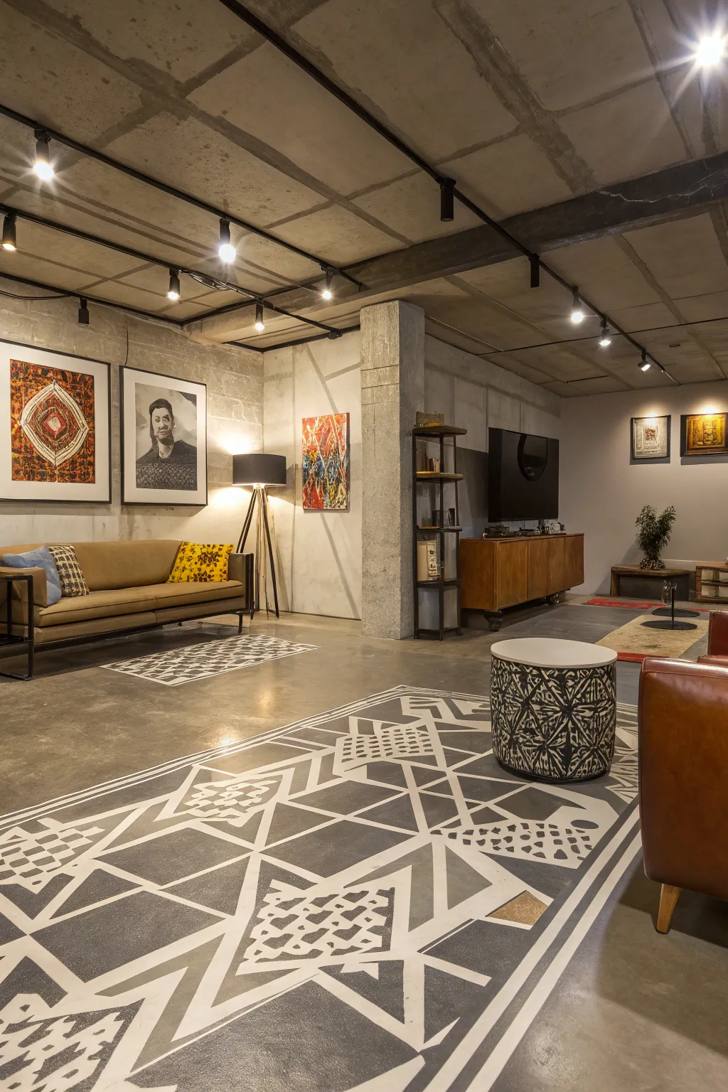Geometric layouts on concrete floors add artistic flair to contemporary spaces.