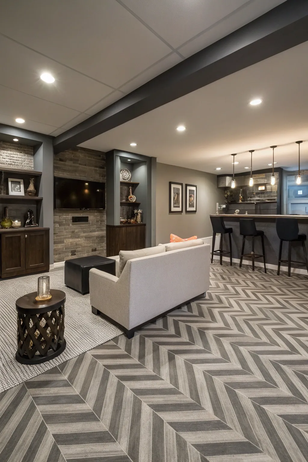 A chevron decoration in vinyl flooring has the ability to present a contemporary, geometrical flair to your basement. I’ve witnessed this transform spaces into sophisticated, modern retreats.