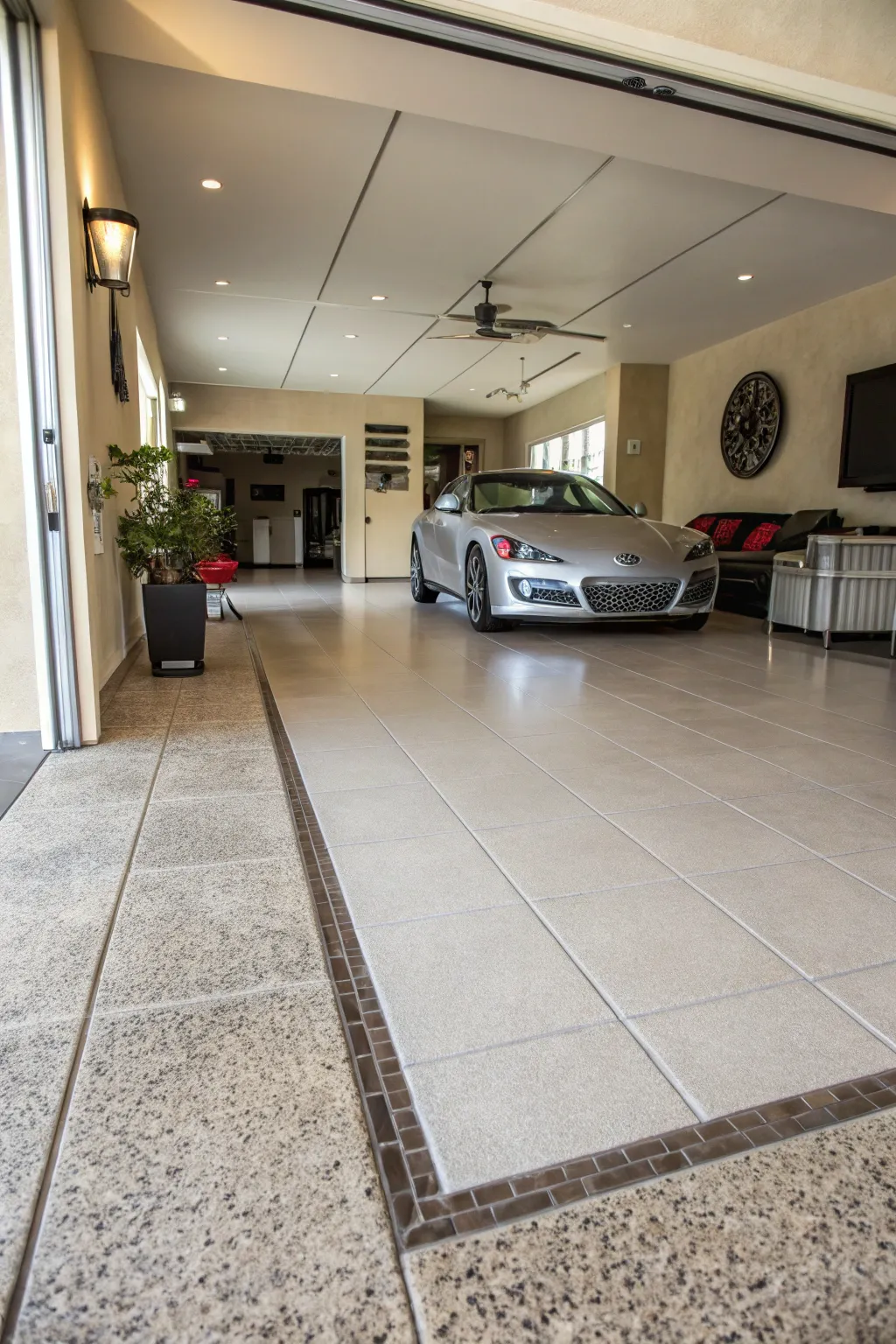Create a seamless transition from your garage to other parts of your home using consistent tiling. This approach offers a unified and sophisticated look.