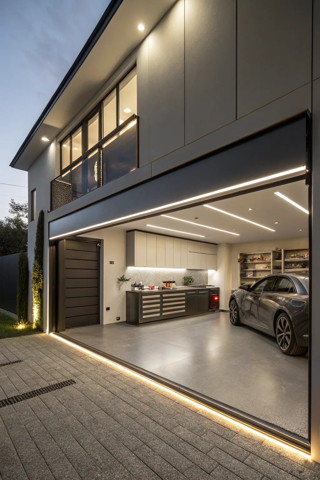 Using premium materials and surfaces, such as polished concrete and integrated lighting, improves the appearance of a garage. I’ve found that these options offer a luxurious touch that is both useful and beautiful.