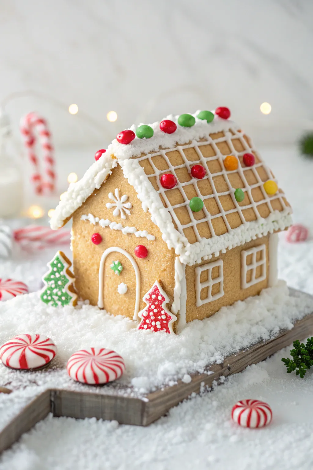 Construct a charming, traditional cottage with honey biscuits forming the walls and roof, enhanced with classic sugar spheres and mint swirls. I find that applying royal icing to simulate snow provides a truly genuine winter ambiance.