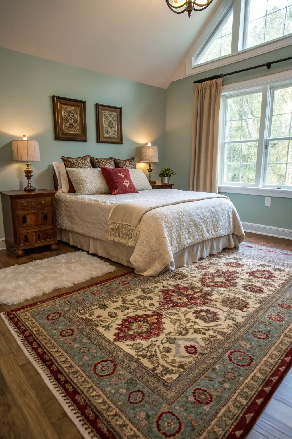 - Oriental Patterned Bedroom Rug: Delineate your bedroom space with this exquisite oriental pattern rug. Introduce sophisticated texture today.