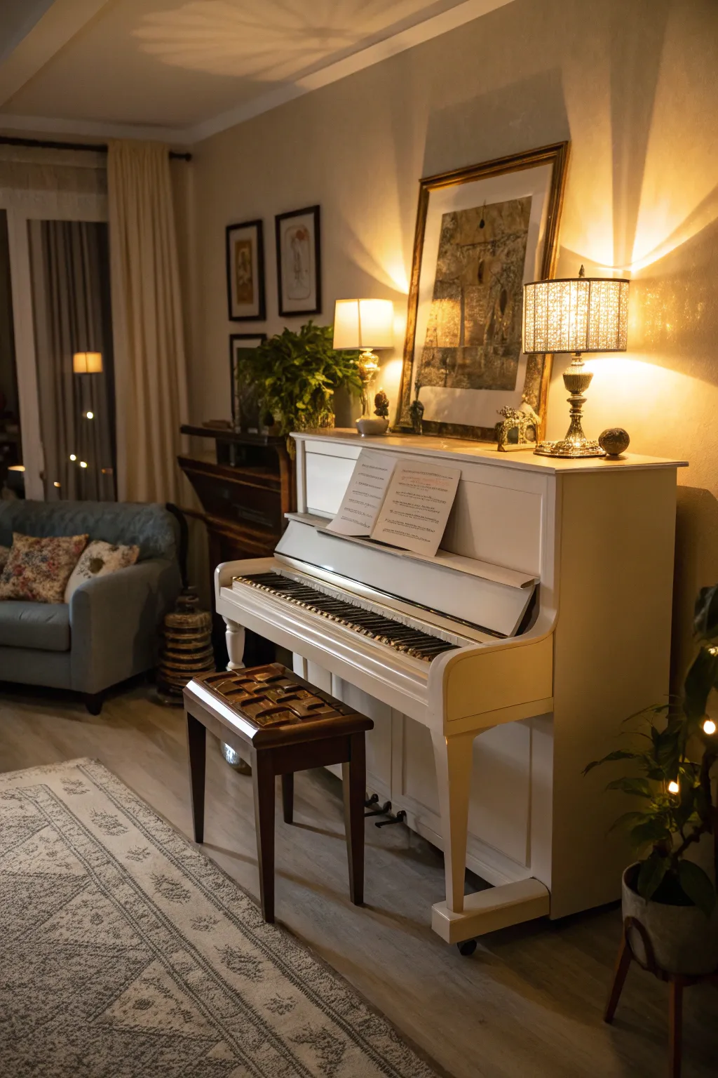 - Ornamental Lights: Enhance ambiance with decorative string lights adding warmth and charm to your piano nook.