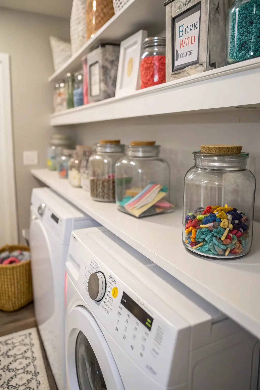 - Glass Stash Vessels with Caps: Organize your laundry essentials beautifully with these chic glass jars. Keep supplies close!