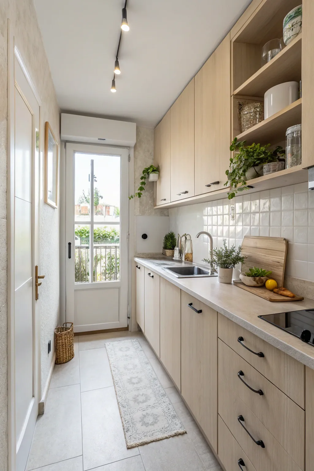 - Polished Wall Segments: Implement polished wall segments to refract illumination, thereby rendering your slender kitchen spacious and welcoming.