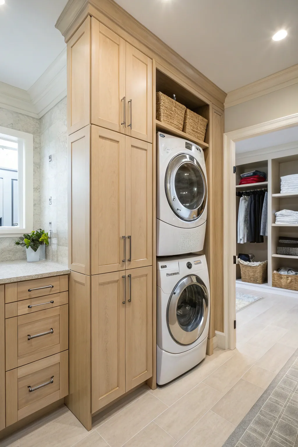 - Patterned Wallcovering: Incorporate elegance and height with vertically striped wallcovering to accentuate stacked washer-dryer units.