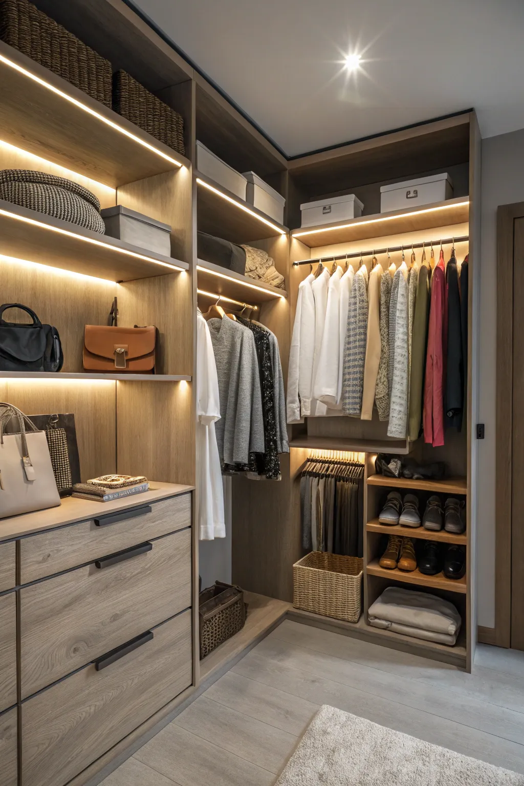 - Adaptable LED Strip Lamps: Outline your closet with these energy-efficient strip lamps for improved visibility and a stylish flair.