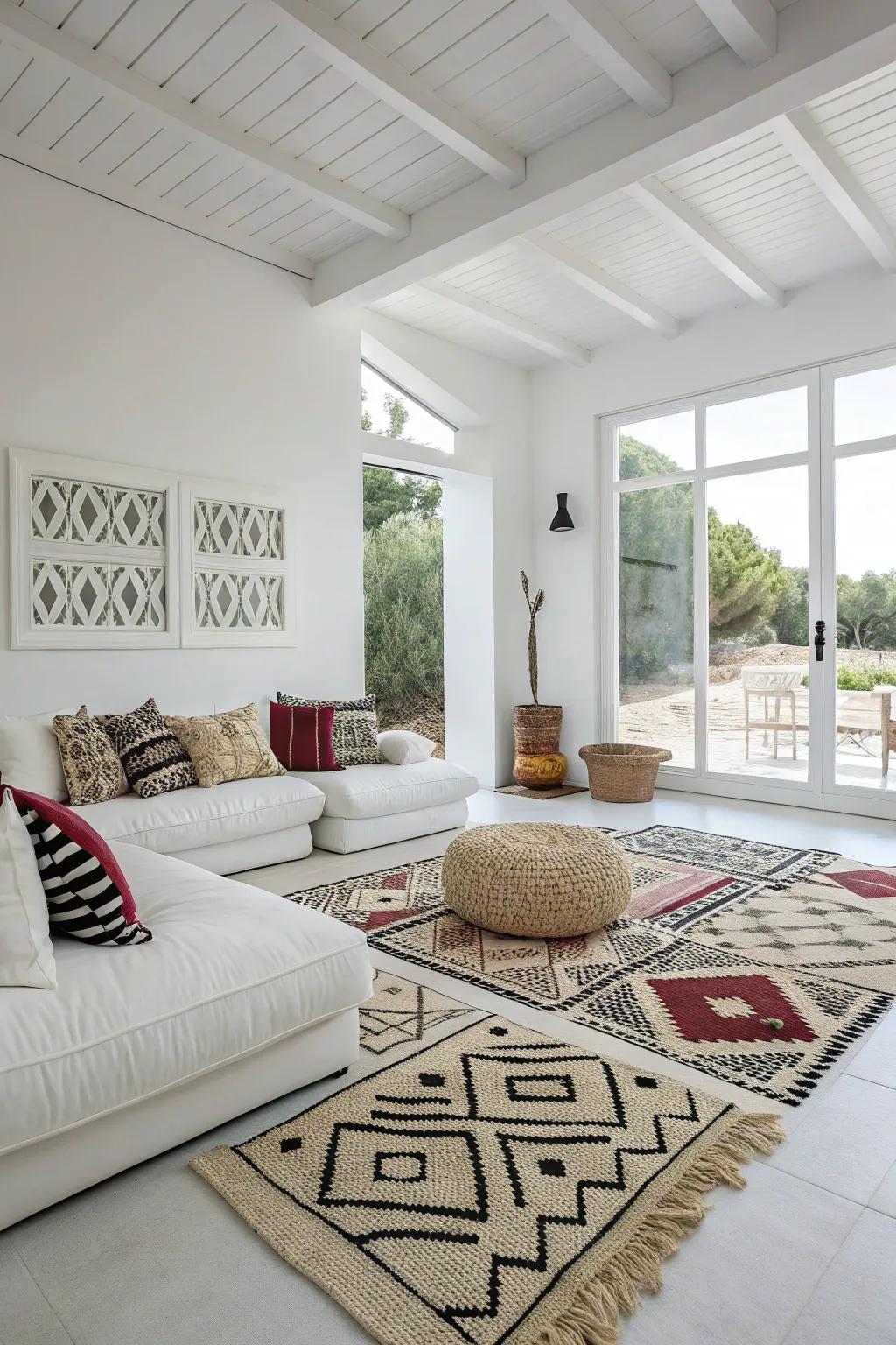 - Symmetrical Scheme Ground Covering: Infuse texture and flair with a symmetrical floor covering that enhances your modern white living quarters.