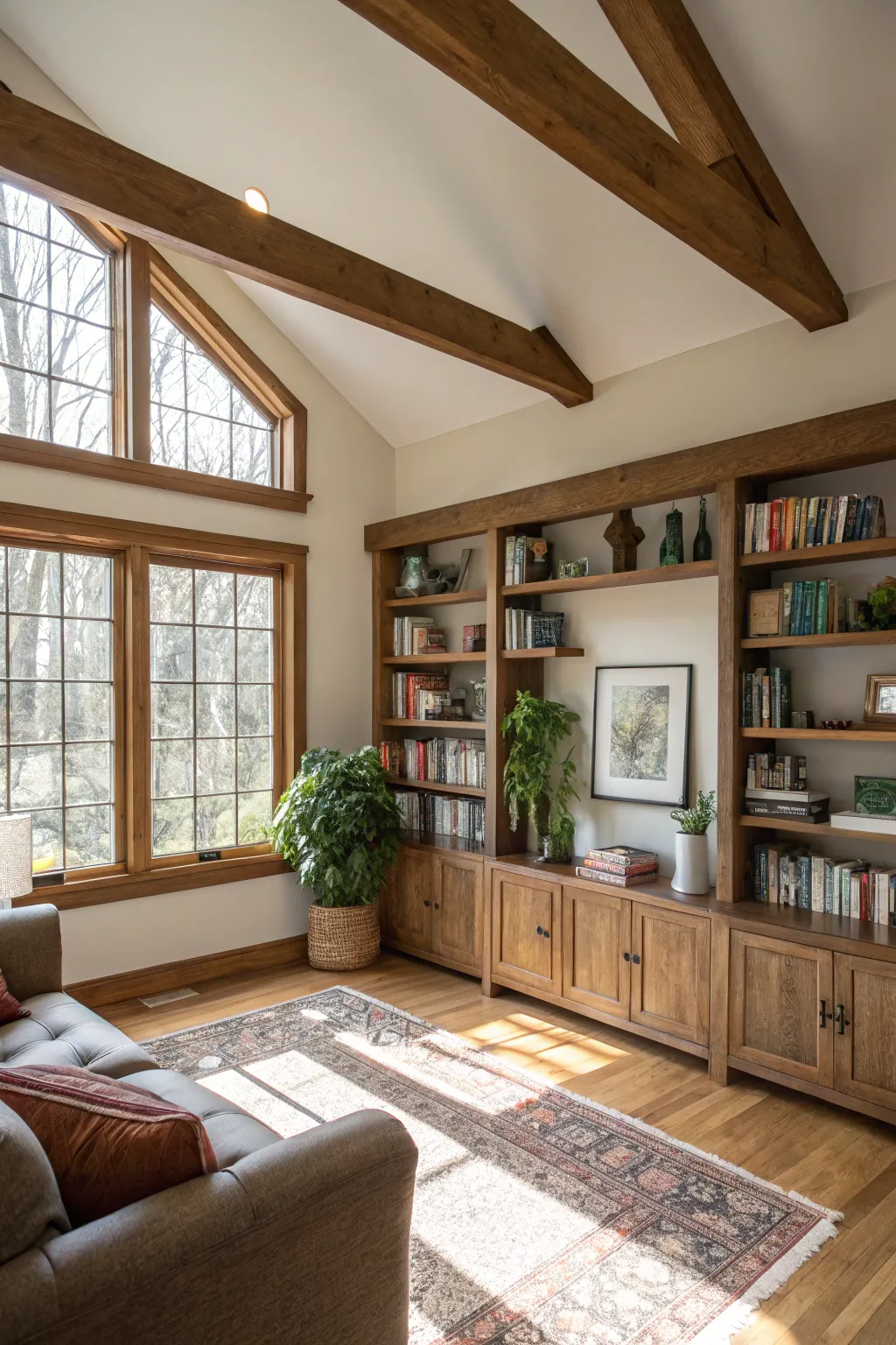 Construct snug alcoves by employing beams to delineate diminutive areas. This is a technique I particularly cherish for its ability to instill a sense of closeness within expansive chambers.