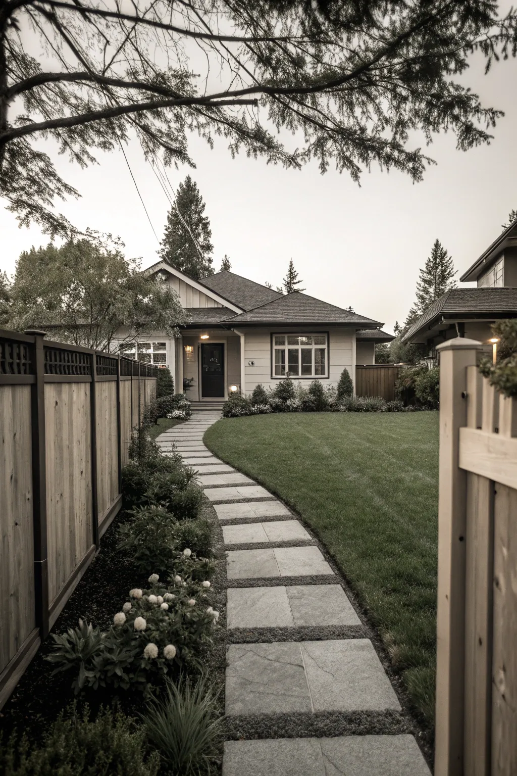A monochrome color scheme creating a sleek visual in a modern front yard.