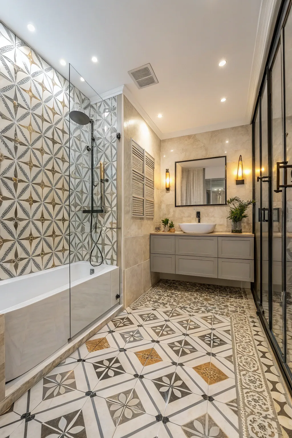 - Artistic Patterned Floor Tiling: Elevate your bathroom’s ambiance with intricate tile designs that add a touch of sophistication.
