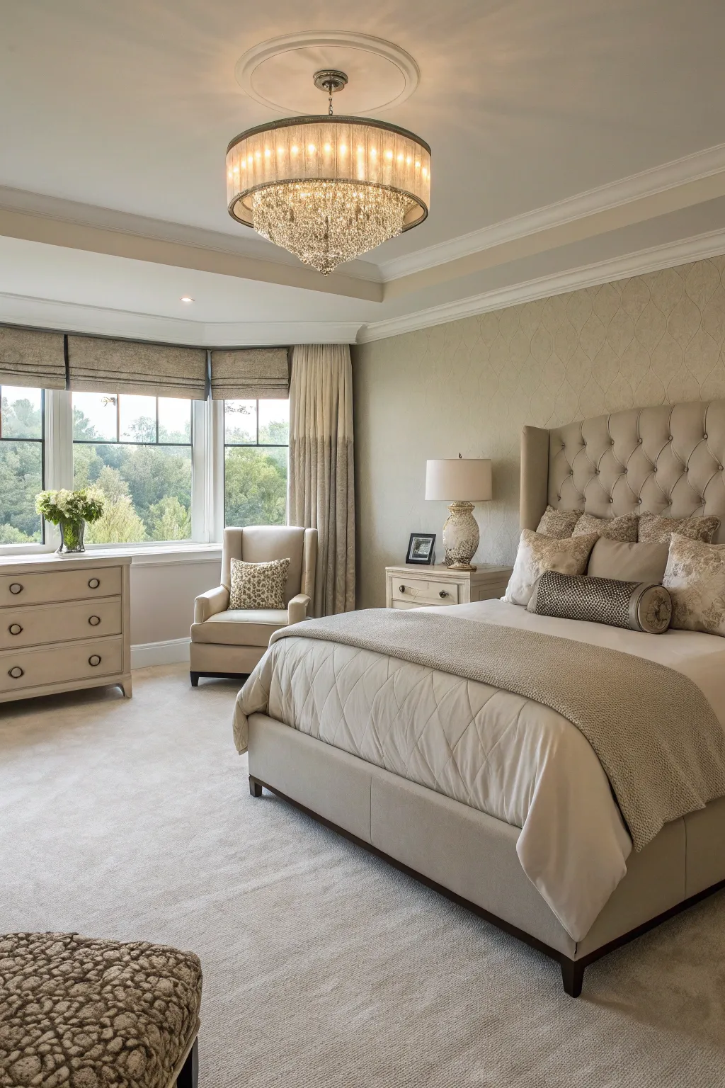 - Refined Chandelier with Adaptable Lighting: Add refinement to your primary bedroom using an exquisite chandelier featuring modifiable lighting.