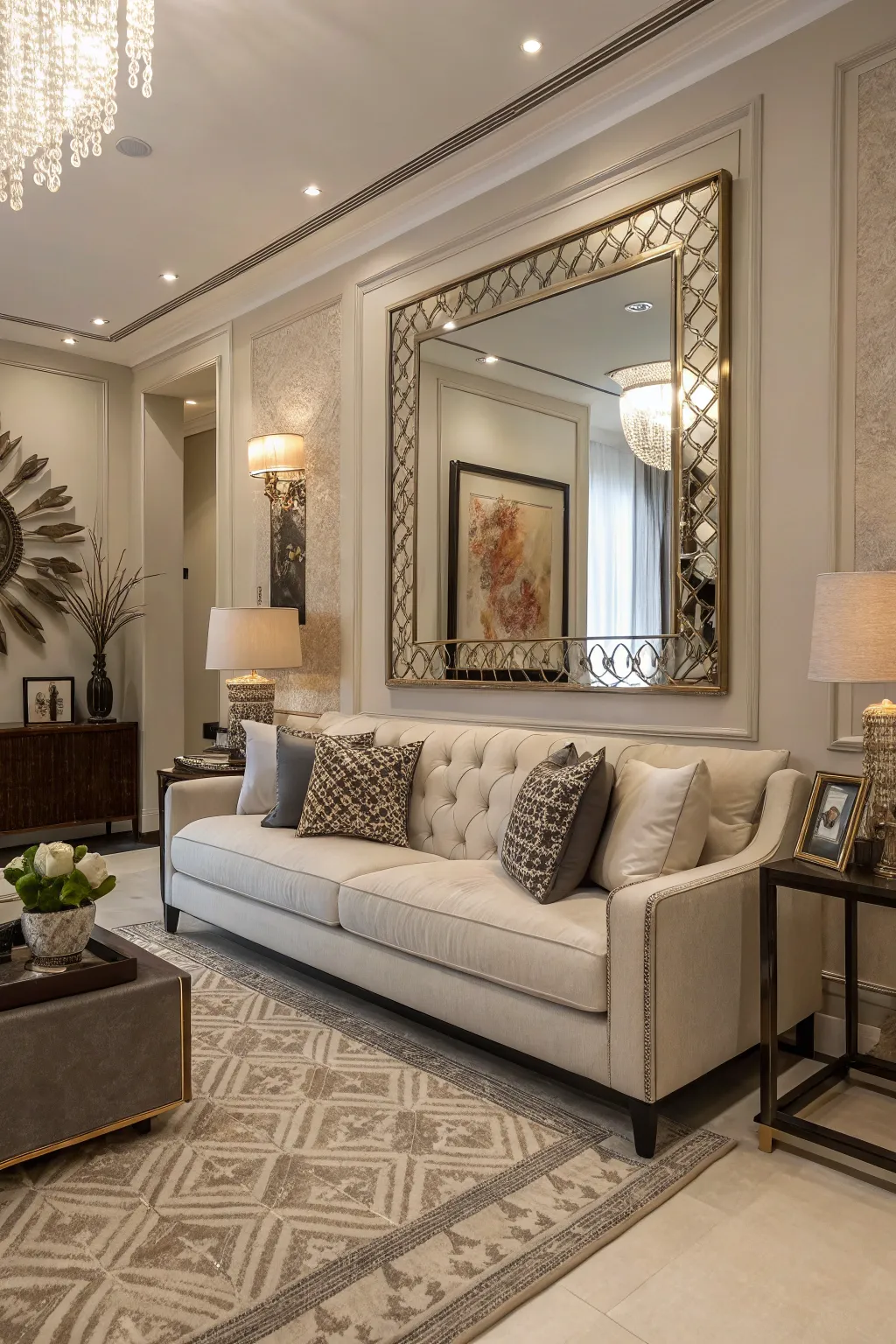 - Elaborate Large Wall Mirror: Infuse sophistication and depth into your living space with a large, elaborate wall mirror.