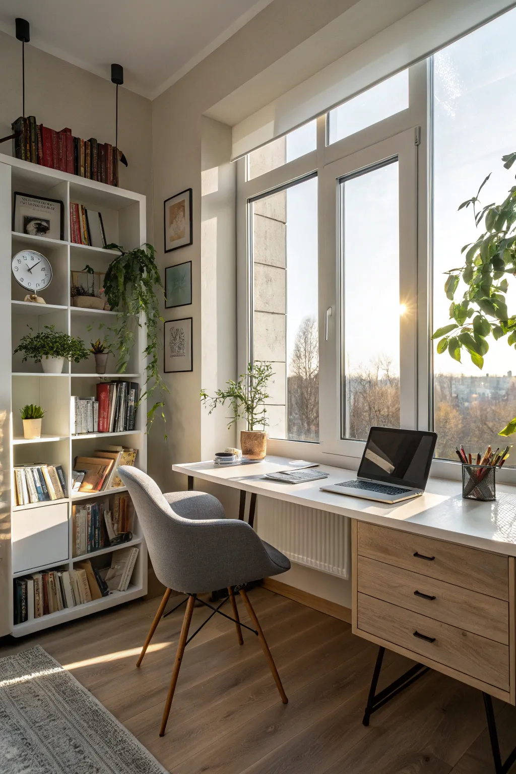 Position your desk near a window to capitalize on natural sunlight, vital for a revitalizing and invigorating workspace. In my designs, I consistently prioritize window placement to maximize this organic resource.