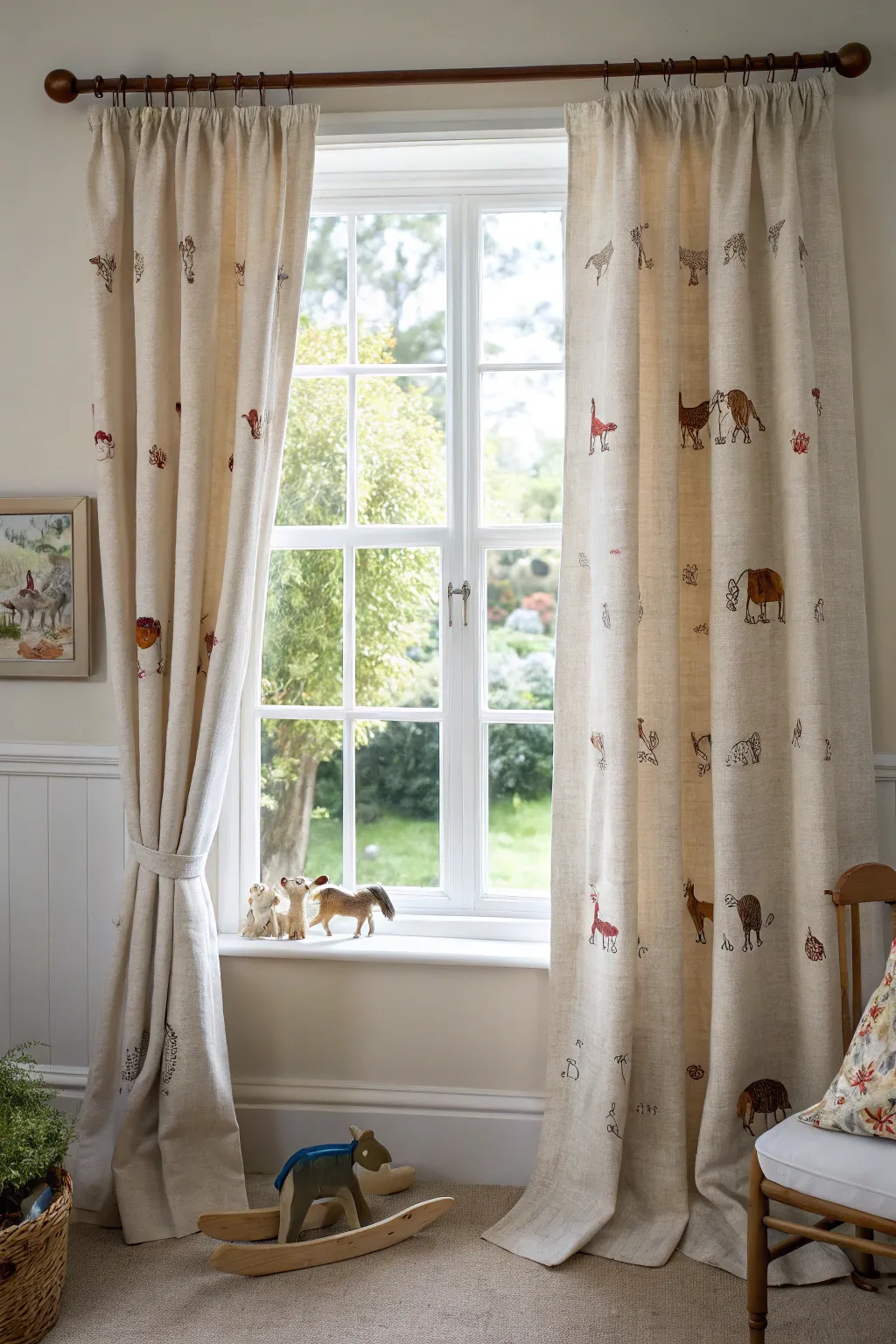 - Cotton Embroidered Creature Draperies: Elevate your baby’s room’s cozy feel with these embroidered cotton draperies featuring barnyard creatures.