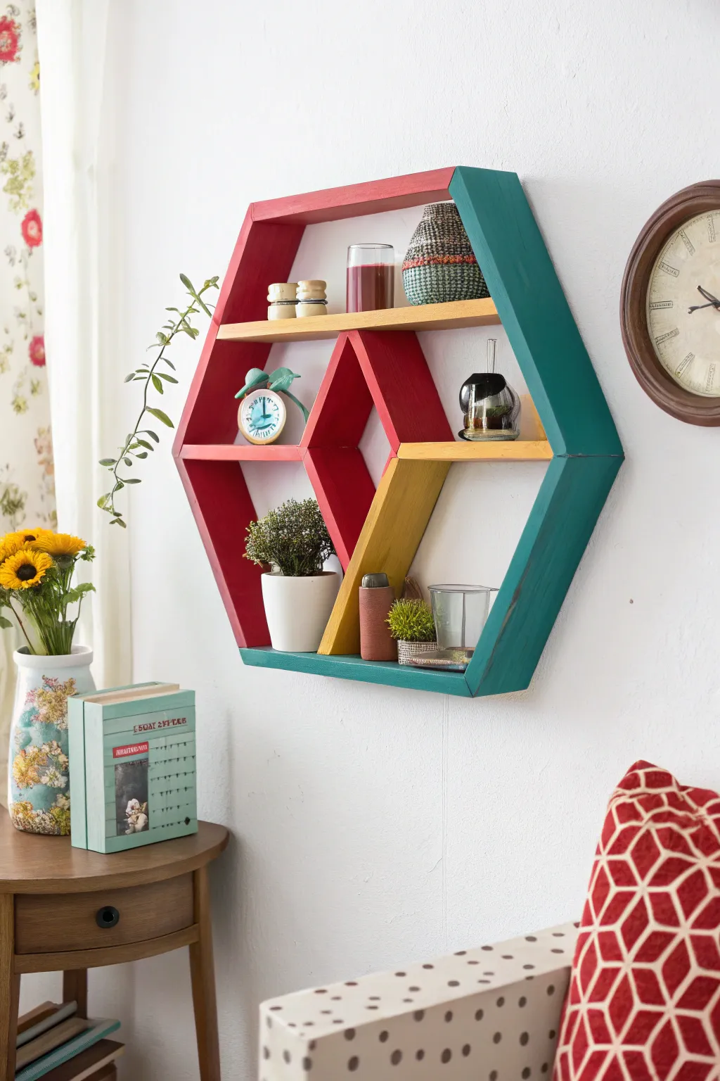 Integrate geometric shelves alongside supplementary geometric forms for a compelling wall installation. I intermixed mine with hexagons and triangles, achieving a visually arresting panorama.