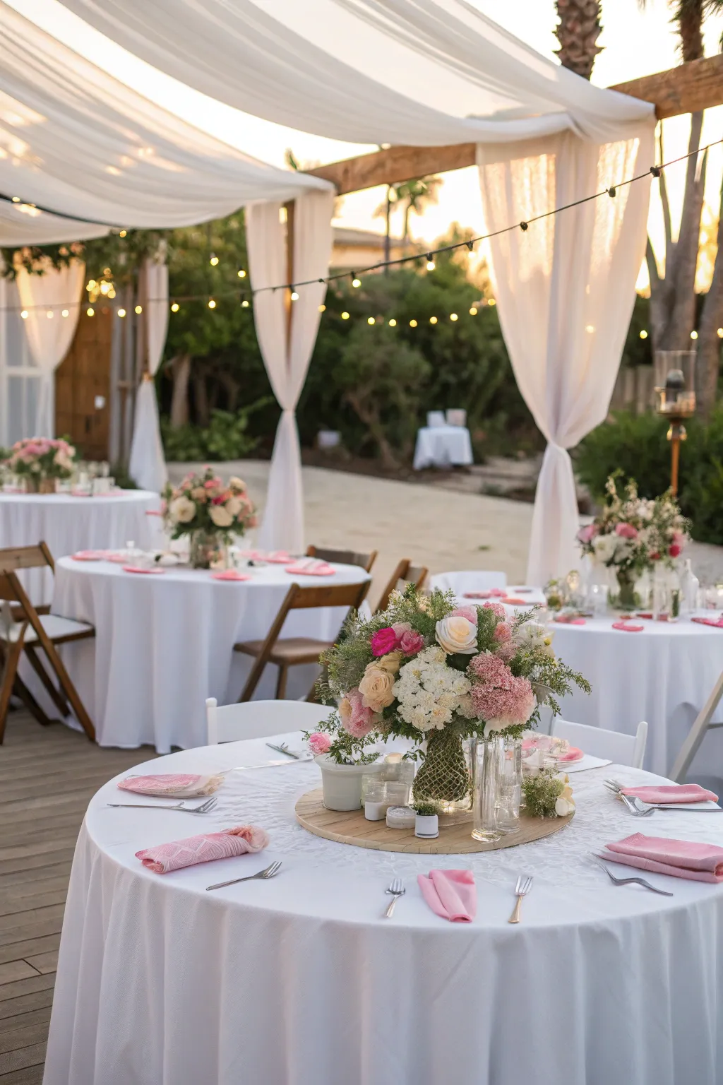 Enhance your tables with fresh botanical arrangements in gentle tones like pink and white. I consistently observe that flowers contribute a hint of innate beauty and sophistication to any gathering.