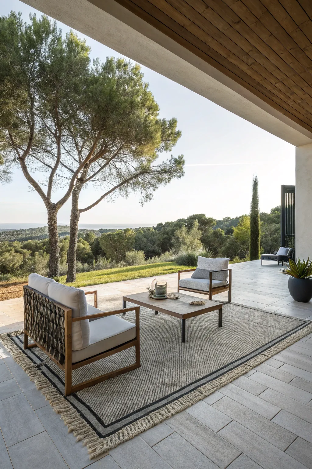 - Simple Border Outdoor Rug: Opt for a rug with a clean border design to keep a sleek, elegant patio appearance.