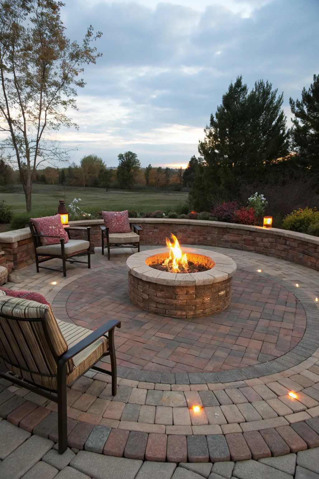 Design a circular blockwork space encircling a brazier for inviting gatherings. I adore how it naturally evolves into the core of social events, inviting warmth and conversation.