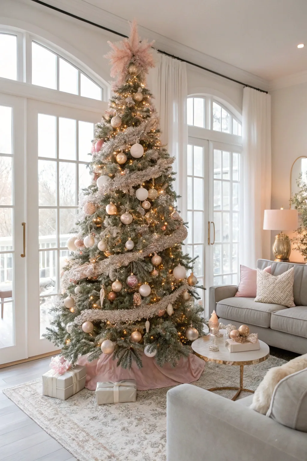 - Decorative Ribbon Garlands in Rose and Silver: Enfold your tree in these rose and silver garlands to amplify shimmer and depth.