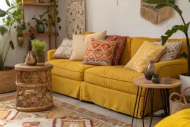 Choose subdued and organic tones accented by vibrant hues for a sense of warmth and character. I frequently use this scheme to cultivate a tranquil yet energetic environment.