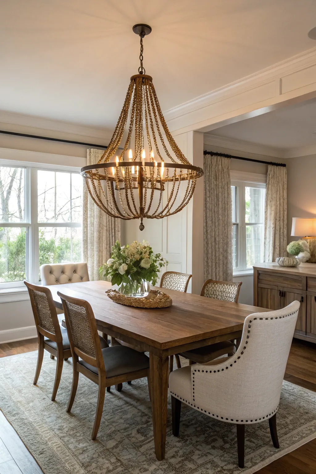 Chandeliers that showcase natural elements like woven cane or bamboo can infuse an organic touch into your dining room. These are especially effective in spaces intended to evoke the outdoors.