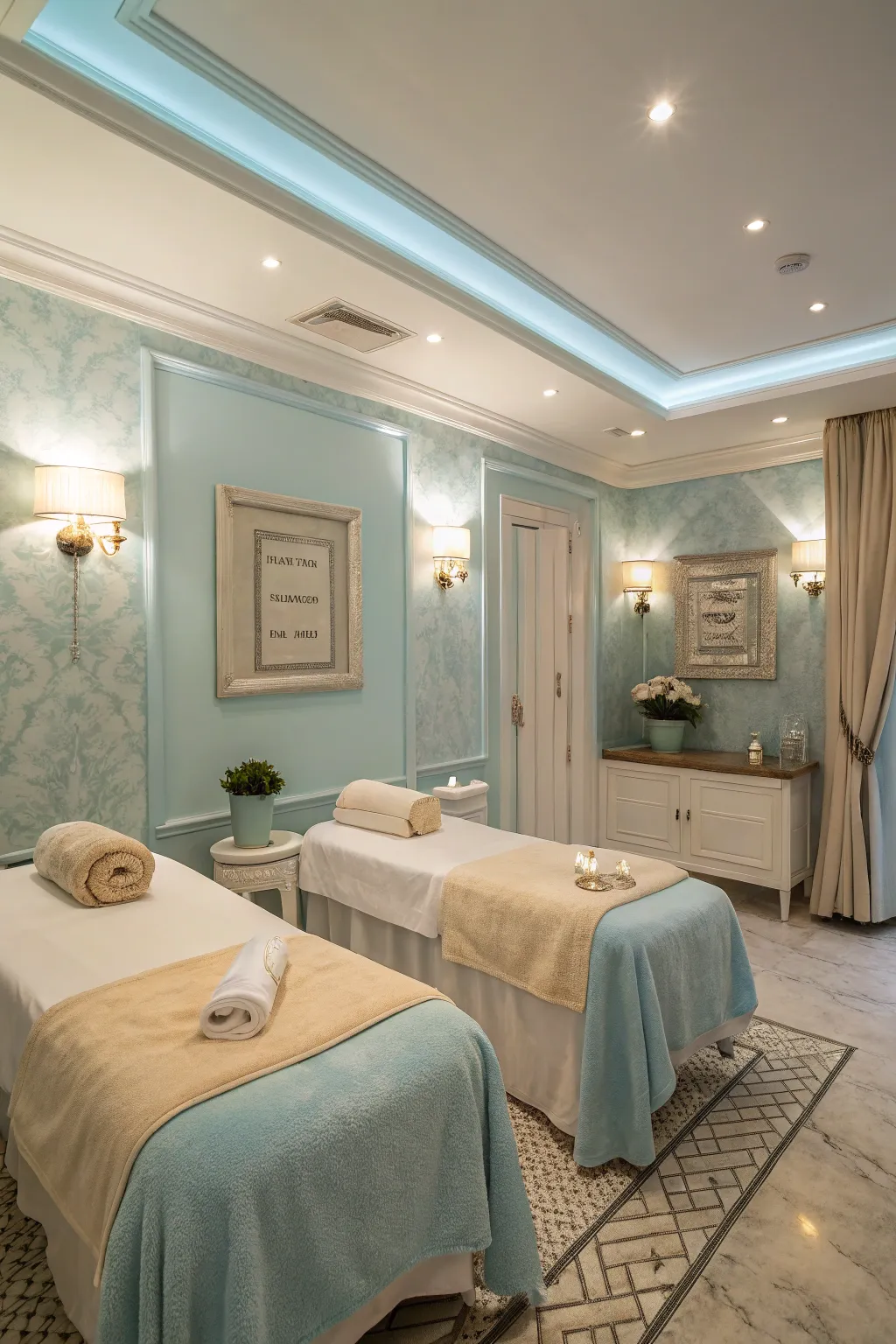 - Subtle Azure Mural Decor: Metamorphose the ambiance of your spa chamber through the incorporation of subtle azure mural decor, effectuating an augmented perception of spaciousness.