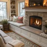 Create a comfortable area beside your stone fireplace with comfortable seating and soft materials. This welcoming corner becomes the ideal spot for relaxation and personal gatherings.