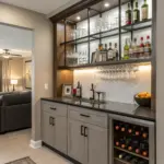 Pairing glass shelves with a mirror results in a streamlined, contemporary appearance, ideal for showcasing your prized spirits. In my experience, integrating subtle lighting further elevates the elegance, making your home bar truly shine.