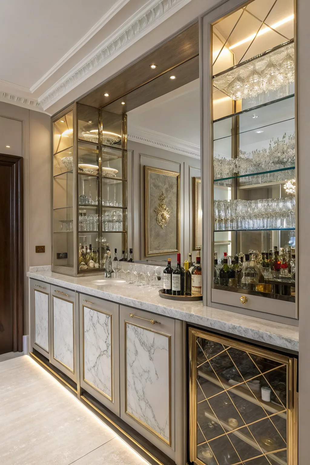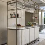 Recreate a traditional bar ambiance using ornate, mirrored shelving with lush wood finishes. It’s a timeless aesthetic that never fades, and one I have always admired for its enduring appeal.