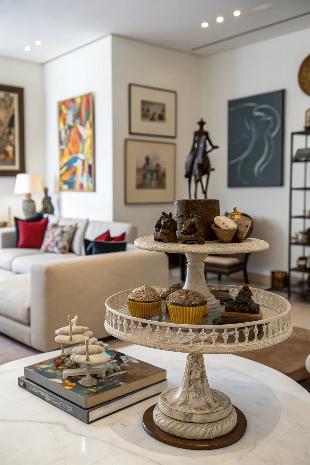 Transform your cake stand into an artistic exhibit by showcasing petite sculptures or art pieces. This constitutes an unparalleled method for expressing your artistic inclinations.