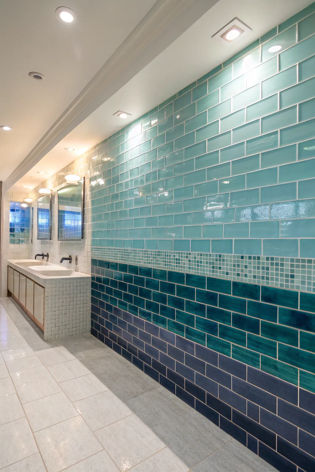 Hue gradients in glass tiles fashion a breathtaking ombre impact.